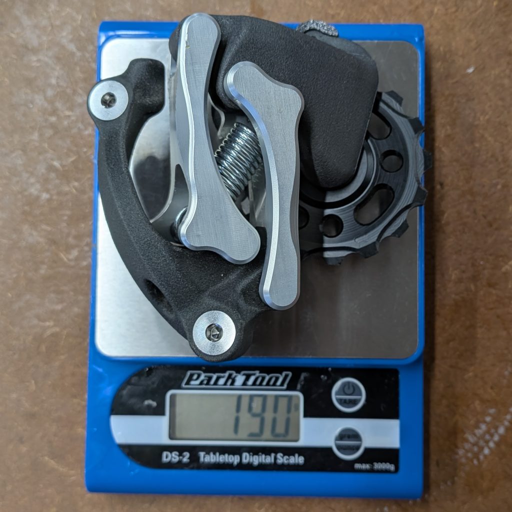 When comparing the combination of the Supre derailleur and chain tensioner to conventional derailleurs, the Supre derailleur + tensioner is about 200g heavier than an XT derailleur and the same weight as an XO T-Type derailleur.